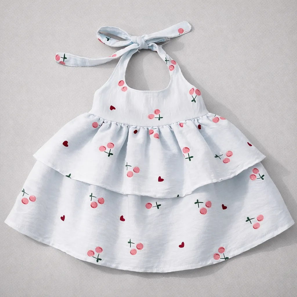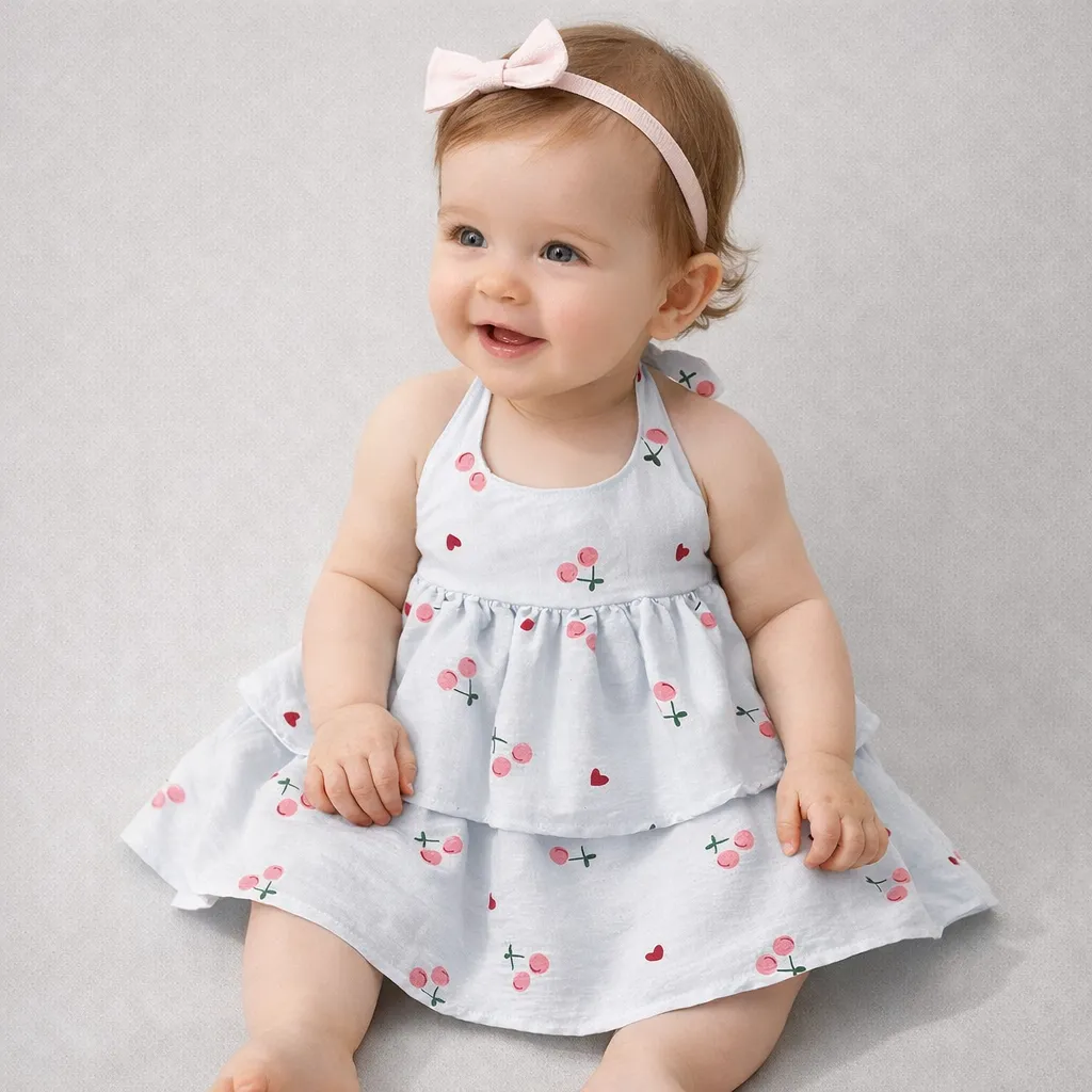 A charming cherry print baby dress crafted from lightweight cotton crepe for breathable comfort. The...