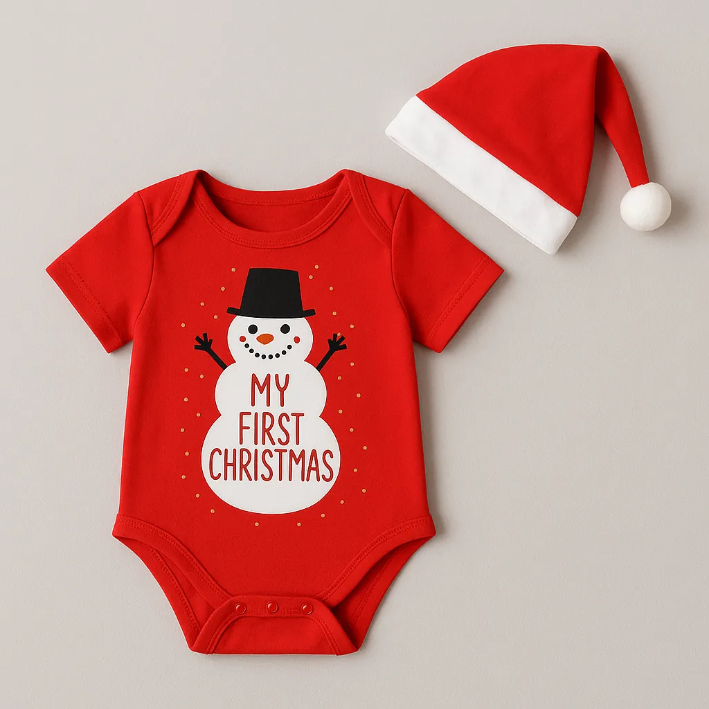 Celebrate baby’s very first Christmas in this adorable red romper featuring a cheerful snowman print...