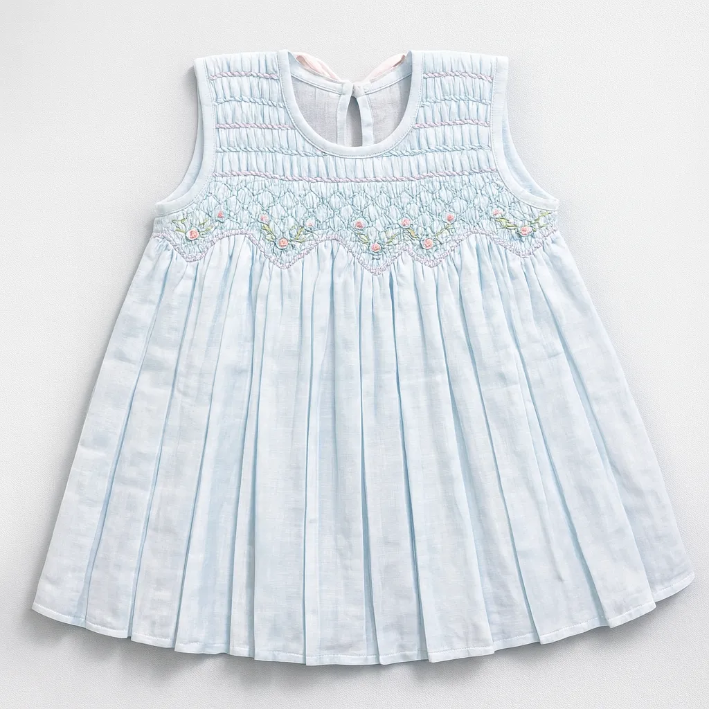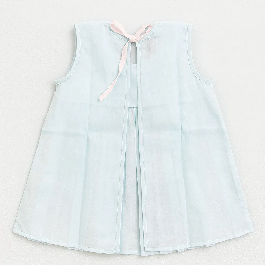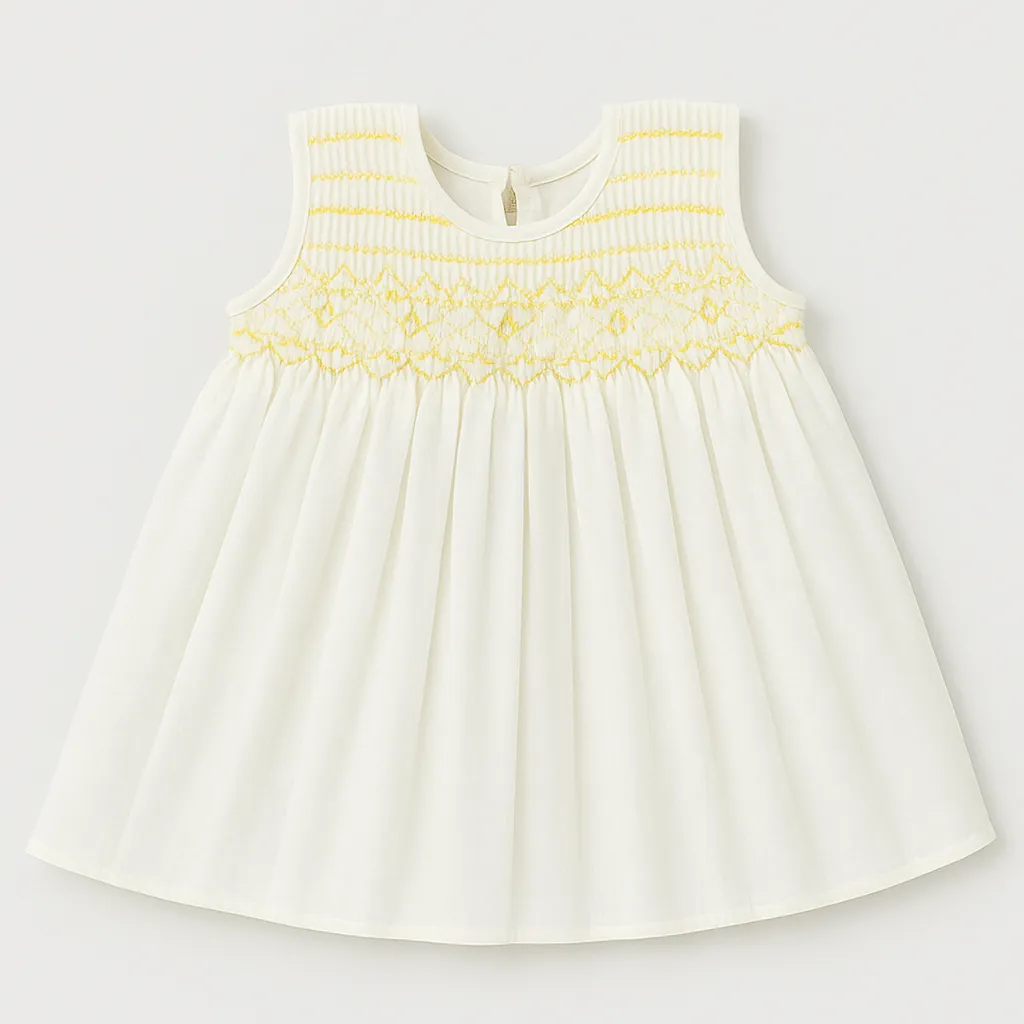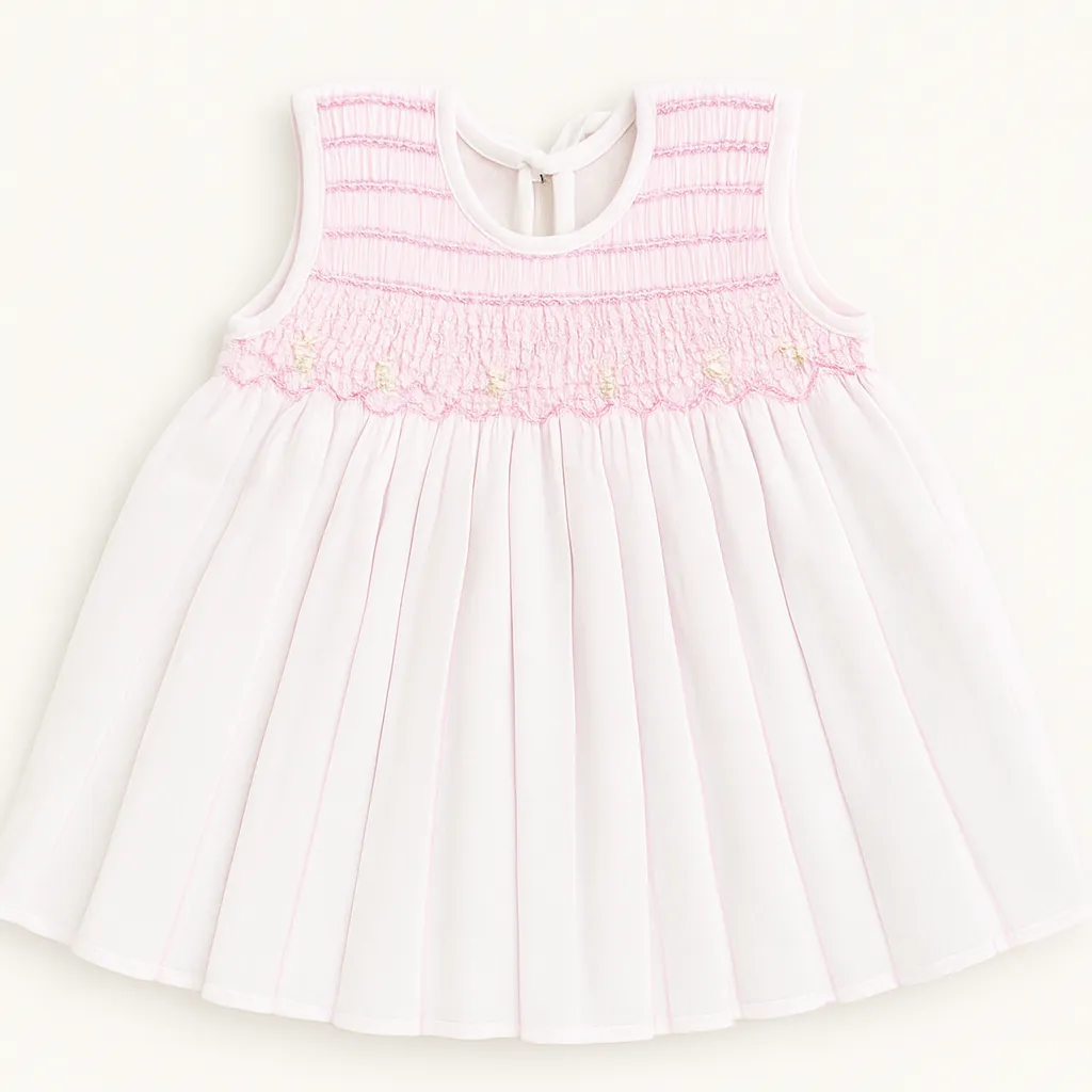 This adorable baby frock features delicate hand-smocked detailing with threads and tiny floral accen...