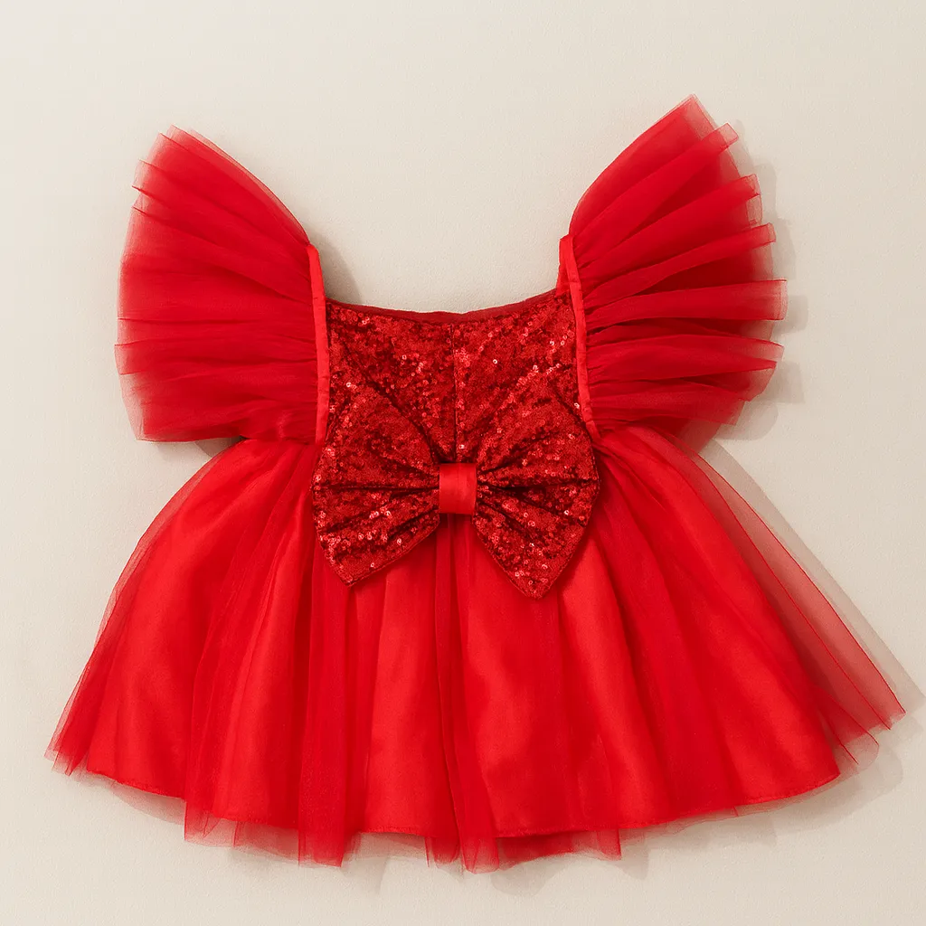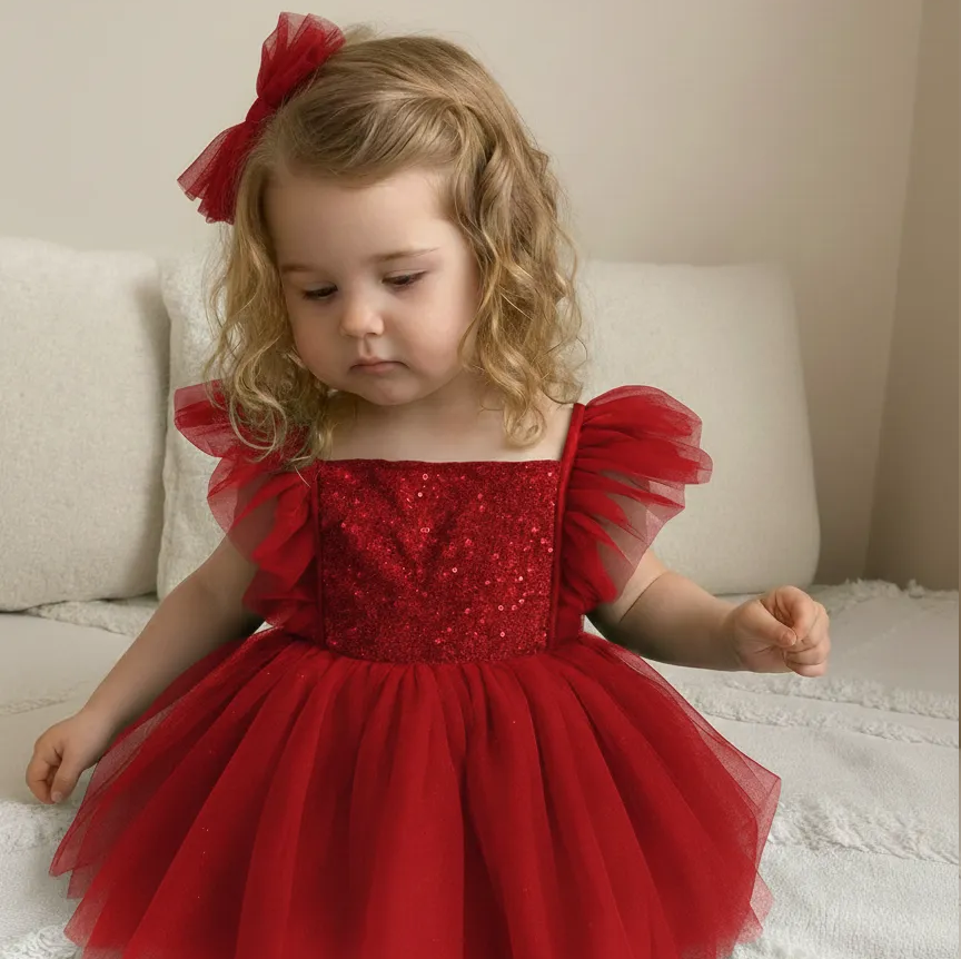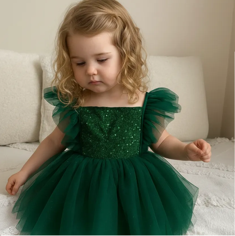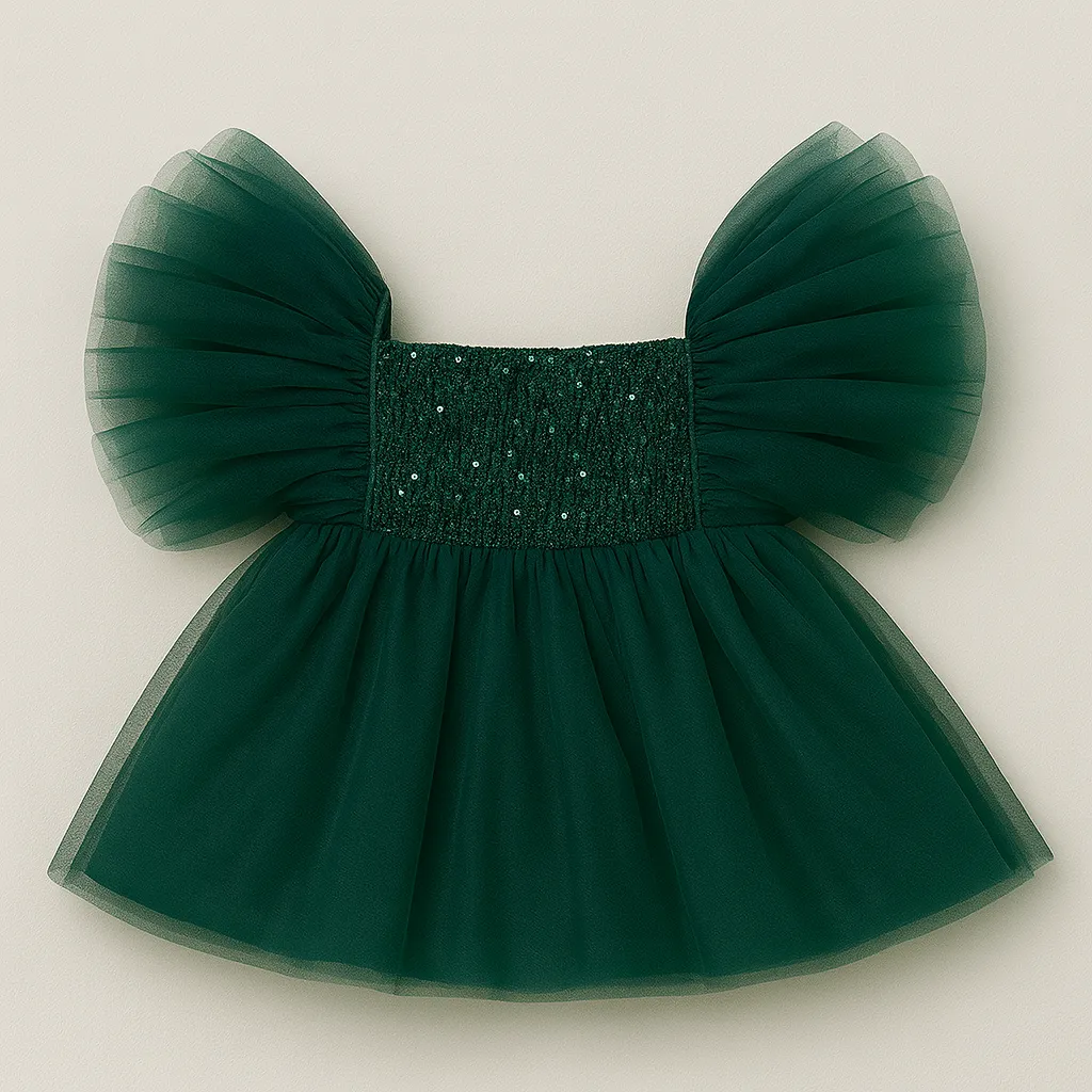 A dazzling party dress featuring a sequined smocked bodice and fluffy tulle sleeves. The soft tulle ...